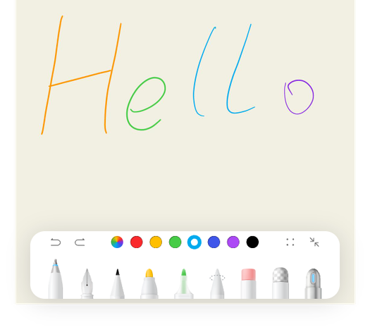 接入手写套件后,可以在应用中创建手写功能界面。界面包括画布和工具栏两部分,画布部分支持手写笔和手指的书写效果绘制,工具栏部分提供多种笔刷和编辑工具,并支持对手写功能进行设置。接入手写套件后将自动开启一笔成形和报点预测功能,无需再单独接入。