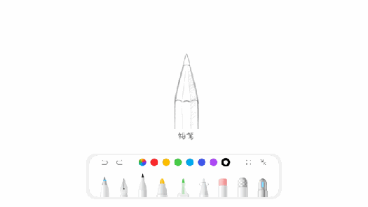 - 笔刷:圆珠笔、钢笔、铅笔、马克笔、荧光笔、马赛克笔、激光笔七种笔刷效果,5档笔宽,100+种颜色选择。