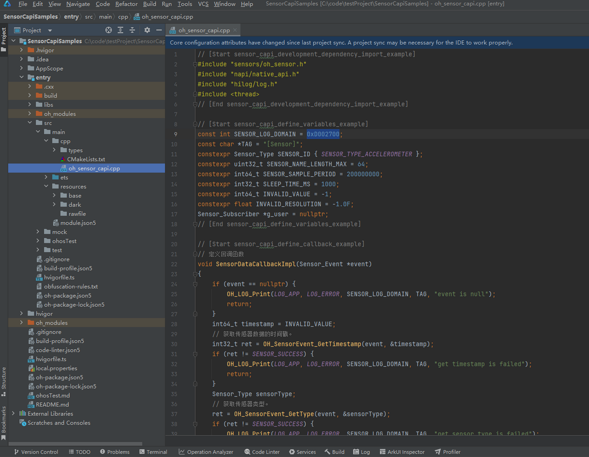 const int SENSOR_LOG_DOMAIN = 0xD002700;const char *TAG = "[Sensor]";constexpr Sensor_Type SENSOR_ID { SENSOR_TYPE_ACCELEROMETER };constexpr uint32_t SENSOR_NAME_LENGTH_MAX = 64;constexpr int64_t SENSOR_SAMPLE_PERIOD = 200000000;constexpr int32_t SLEEP_TIME_MS = 1000;constexpr int64_t INVALID_VALUE = -1;constexpr float INVALID_RESOLUTION = -1.0F;Sensor_Subscriber *g_user = nullptr; -