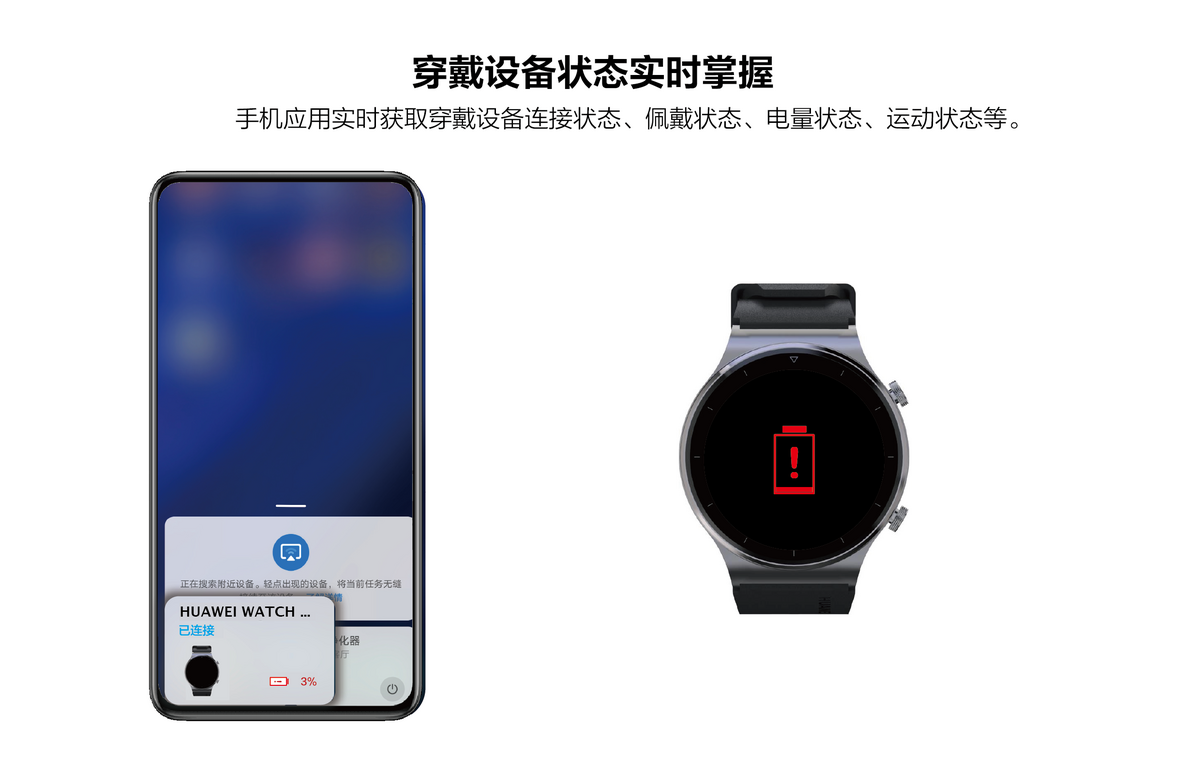 穿戴设备状态实时掌握,如:手机侧App实时获取穿戴设备侧连接状态、佩戴状态、电量状态等,给用户提供更多增值服务。