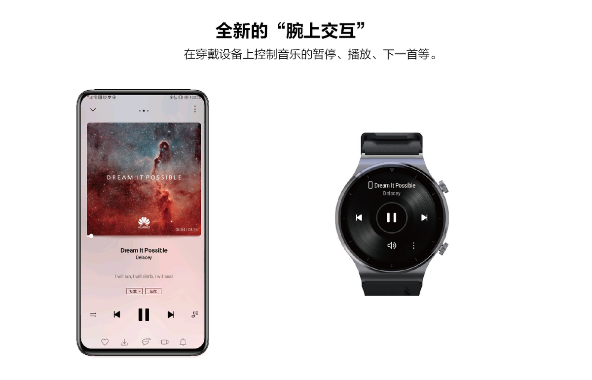 为手机应用带来全新的“腕上交互”,如:用手机侧App看视频、听音频时,可以通过穿戴设备侧App操控手机侧App,比如暂停,下一首,停止等。