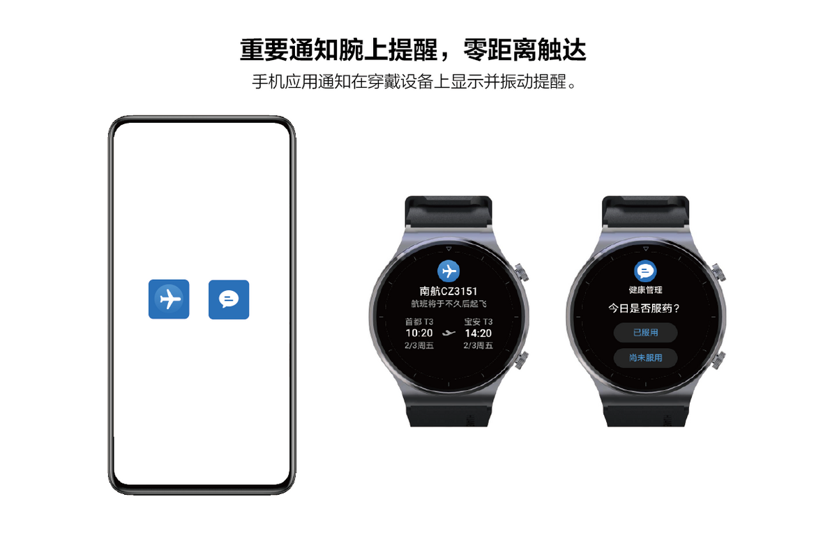 重要通知实现腕上提醒,实现即时通知推送,如:在手机侧App中设置日程提醒、用药提醒、任务提醒等数据,可以同步到穿戴设备侧App中,不用打开手机,也可以随时在穿戴设备上查看重要信息。