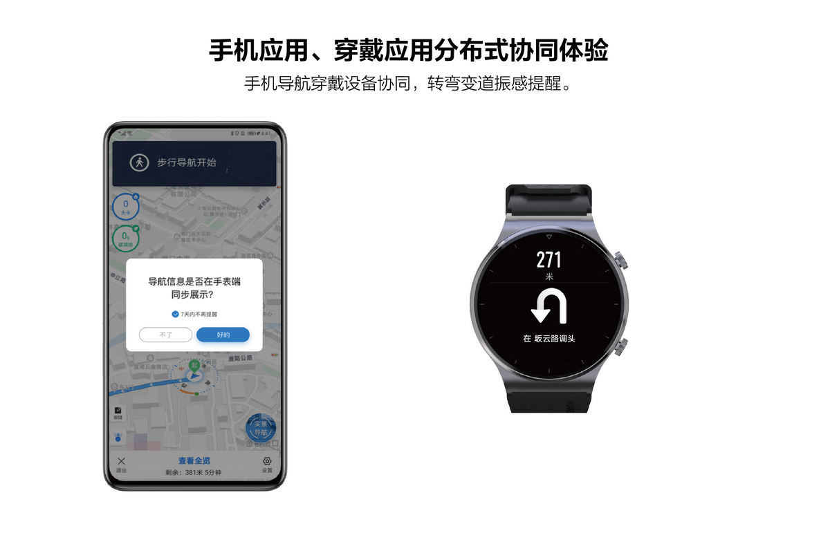 手机侧和穿戴侧的实时协同体验。如:在手机侧App开启导航,可以通过穿戴设备侧App提示用户左转、直行、右转等。在走路或骑行时,不用每次拿出手机查看路线。