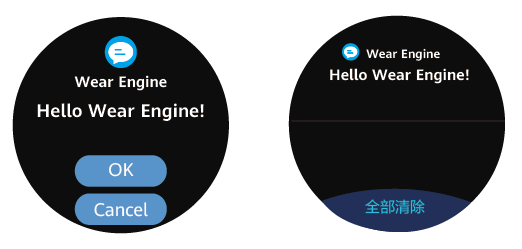 手机侧应用向穿戴设备发送通知,并在穿戴设备上按模板显示,支持穿戴设备收到通知后同步振动或响铃(跟随穿戴设备系统设置)。执行成功后,穿戴设备上会显示下图所示通知界面。