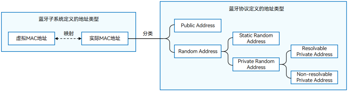 - 蓝牙协议定义的地址类型。蓝牙协议定义的蓝牙设备地址类型主要可以分为两大类:Public Address和Random Address。传统蓝牙使用的是Public Address,低功耗蓝牙可以使用Public Address和Random Address。其中,Random Address又包括Static Random Adress和Private Random Address两种类型。Private Random Address可以继续分为Non-resolvable Private Address和Resolvable Private Address两种类型。每种地址类型介绍如下: