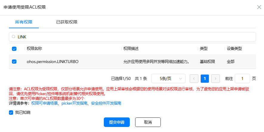 在权限搜索框中输入"ohos.permission.LINKTURBO"找到LINKTURBO的权限并勾选,再提交申请。