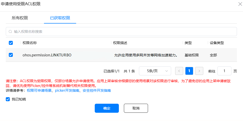 其中ohos.permission.LINKTURBO权限为受限ACL权限,需要特别配置和申请,具体操作步骤参考配置签名和受限ACL权限申请。