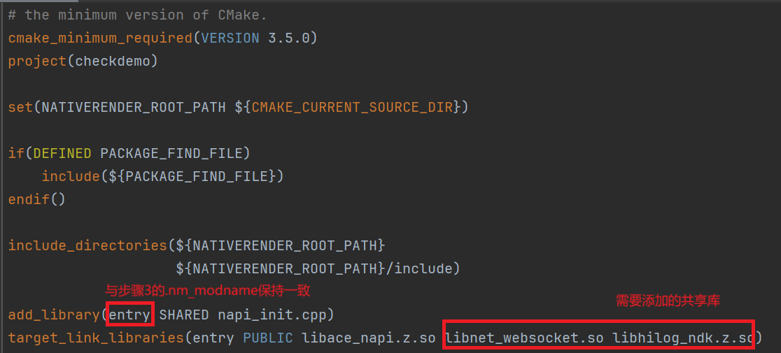 注意:如图所示,在add_library中的entry是工程自动生成的modename,若要做修改,需和步骤3中.nm_modname保持一致。