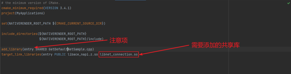 配置CMakeLists.txt,本模块需要用到的共享库是libnet_connection.so,在工程自动生成的CMakeLists.txt中的target_link_libraries中添加此共享库。