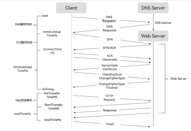 请求开始 (0时刻) -> nameLookupTimeMs(DNS解析)-> connectTimeMs(建立连接)-> tlsHandshakeTimeMs(TLS握手)-> preTransferTimeMs(请求业务数据发送到服务器的时间点) -> startTransferTimeMs(从服务器接收到首包数据的时间点)。
