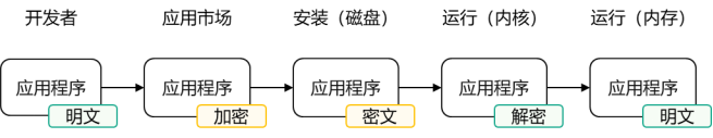 - 内核级的安全保护,应用端到端加密,应用启动后再按需解密执行。