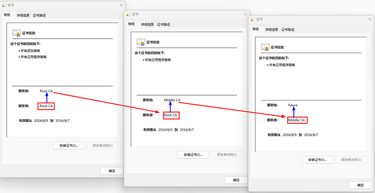 证书链是由一组证书组成的证书集合,以图中样例证书文件为例,即可放在一个证书链中。