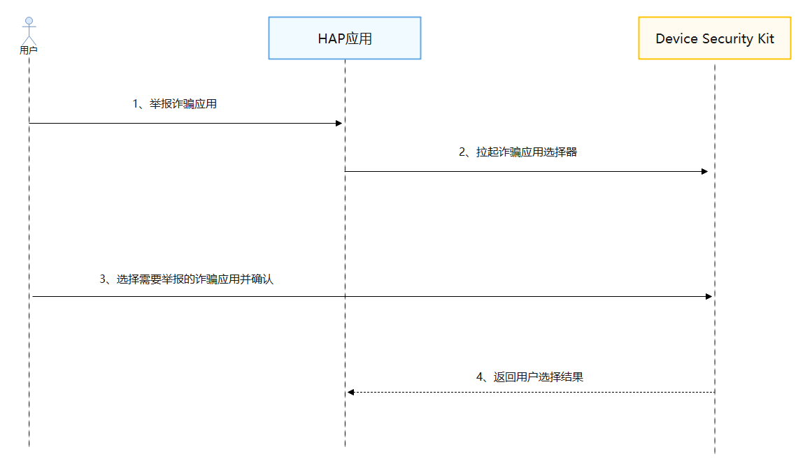 - 开发者应用调用Device Security Kit的接口拉起诈骗应用选择器。