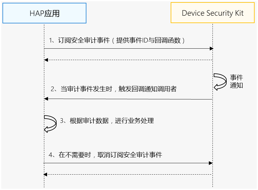 - Device Security Kit调用回调函数通知开发者应用,开发者应用根据审计数据进行业务处理。