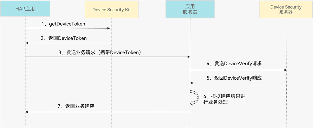 应用通过调用Device Security Kit的getDeviceToken接口获取到DeviceToken,应用的服务器使用DeviceToken到Device Security服务器查询和管理应用在该设备的使用状态,应用在无法获取到持久化设备标识的情况下也可以对设备的应用状态进行记录和查询。