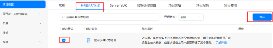 选择“开放能力管理”Tab页,找到需要使用的功能,点击左侧的按钮,开通相应的功能。