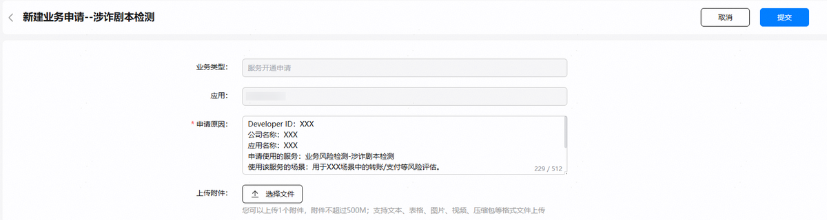 ③ 参考“申请原因”中的模板,提供申请必需的相关信息,包含Developer ID、公司名称、应用名称、使用场景、使用该服务的合法基础(应用使用该服务时需在其隐私声明中进行个人数据声明及用途说明,详细参考个人数据处理说明,并将合法基础的相关证明上传至申请附件),然后点击“提交”按钮。