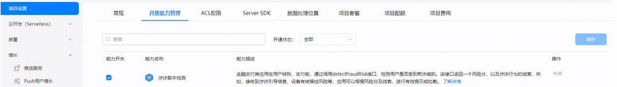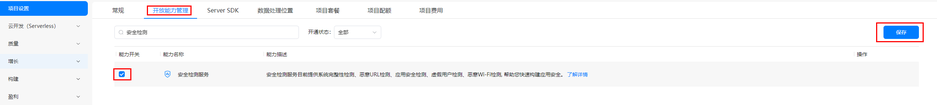 安全检测:勾选“安全检测服务”并点击“保存”,接入“安全检测服务”。