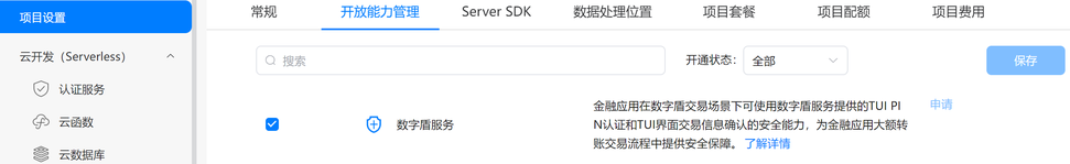 数字盾服务:点击“数字盾服务”右侧申请按钮,接入“数字盾服务”,审核通过后勾选对应服务并点击“保存”该服务配置。