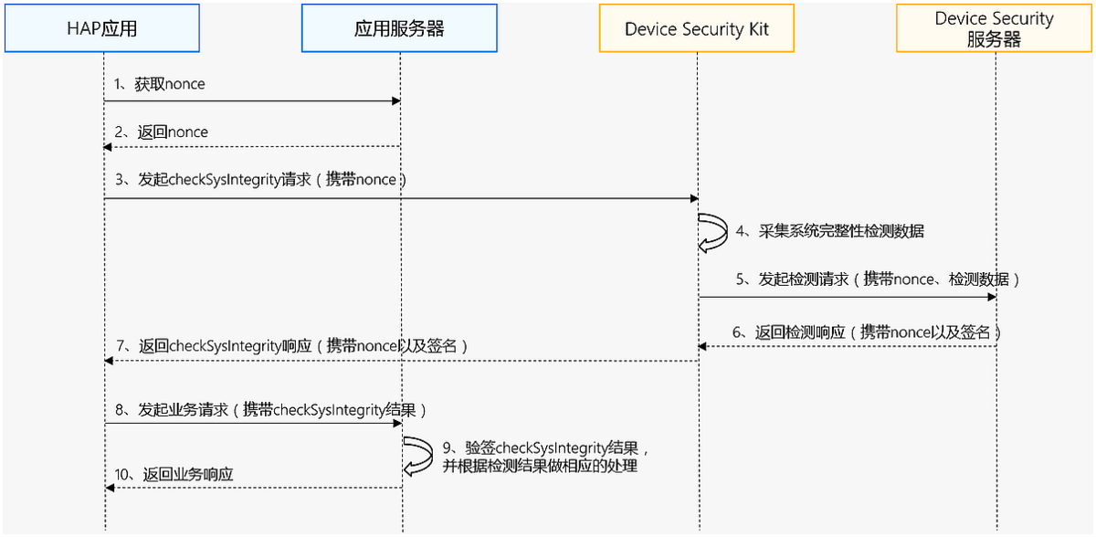 Device Security Kit收到请求后,首先采集系统完整性检测数据,然后将检测数据与nonce一起发送到Device Security服务器做检测,最后通过checkSysIntegrity接口的返回值将检测结果传递给开发者应用。