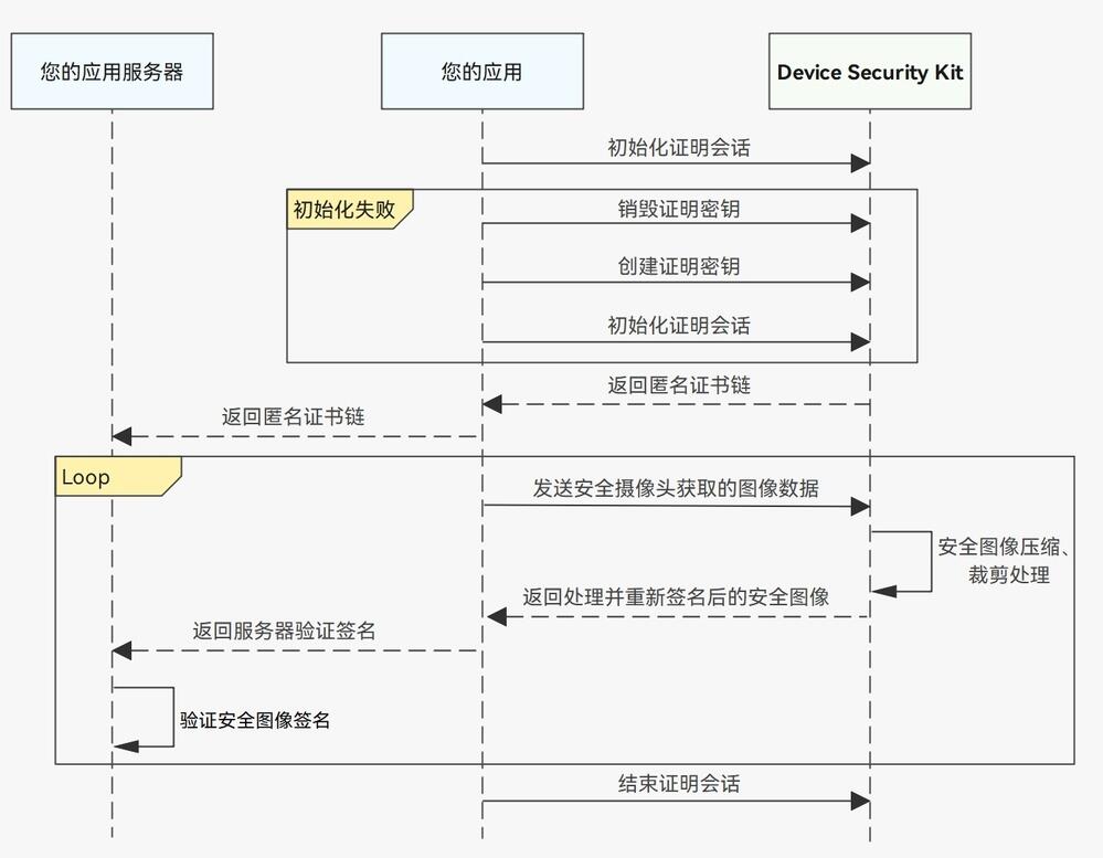 // 结束证明会话的参数const finalProperties: Array<trustedAppService.AttestParam> = [{tag: trustedAppService.AttestTag.ATTEST_TAG_DEVICE_TYPE,value: trustedAppService.AttestType.ATTEST_TYPE_SECIMAGE_PROCESS}];const finalOptions: trustedAppService.AttestOptions = {properties: finalProperties,};// 结束证明会话try {await trustedAppService.finalizeAttestContext(finalOptions);} catch (err) {const error = err as BusinessError;console.error(`Failed to finalize attest context, message:${error.message}, code:${error.code}`);}如果需要销毁证明密钥,请在结束证明会话后,调用destroyAttestKey接口。由于安全摄像头、安全地理位置和安全图像压缩、裁剪共用同一个证明密钥,销毁前需要保证其余场景功能未在使用该证明密钥。