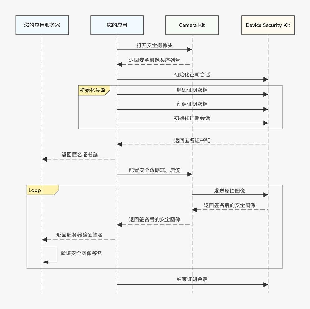 在安全摄像头场景中,通过创建证明密钥、打开证明会话的方式,对安全摄像头捕捉到的图像数据进行签名,确保图像数据的真实性和完整性。