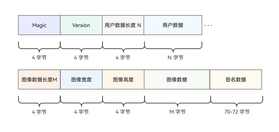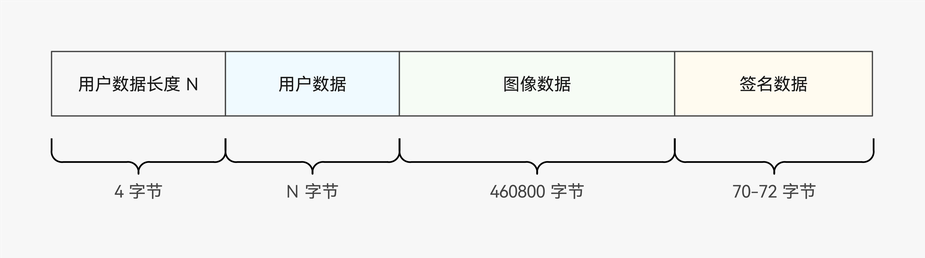 其中,用户数据和图像数据为被签名的原始数据,图像数据长度固定为460800字节,签名数据是Base64编码的签名结果,开发者需要解析出这些数据用来验证安全图像数据签名。参考代码如下: