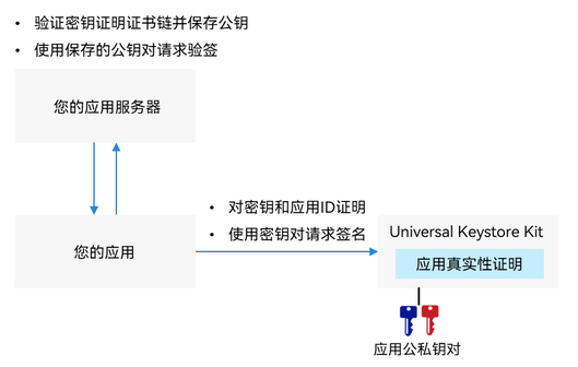 您的应用可以通过调用Universal Keystore Kit相关接口,并在您的服务器上完成对应的校验,以验证应用请求的真实性。
