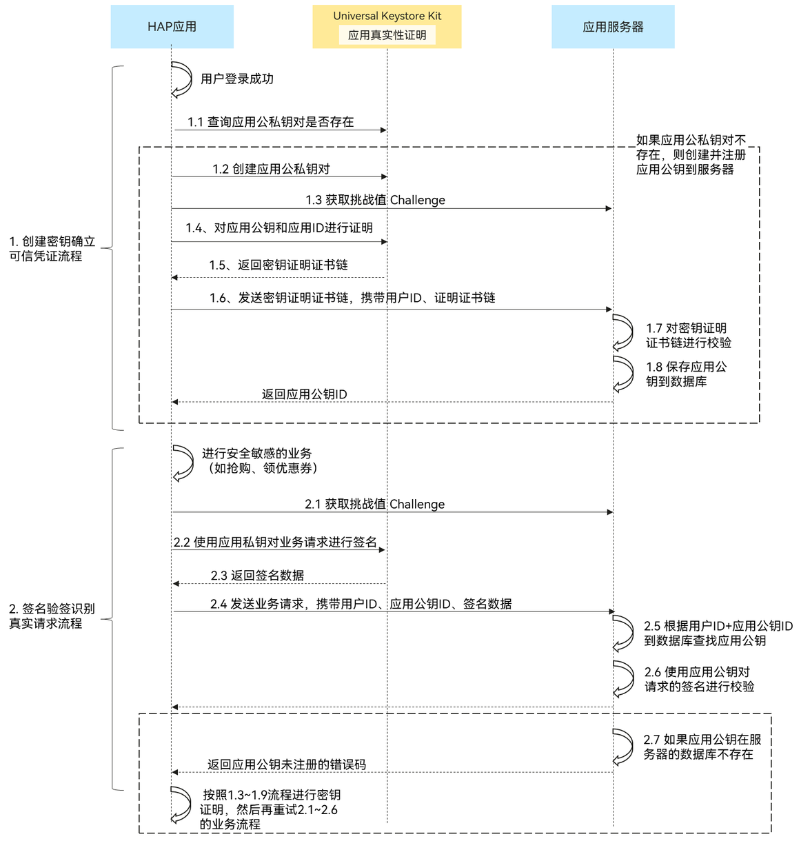 1.8流程进行创建密钥确立可信凭证处理,处理成功后再重试2.12.6的业务流程。应用可能会基于服务器数据库容量的考虑,会删除长时间不使用的应用公钥记录,此时会触发步骤7。