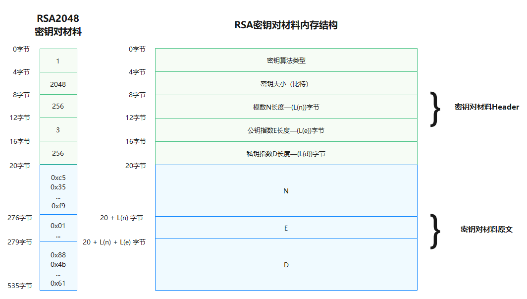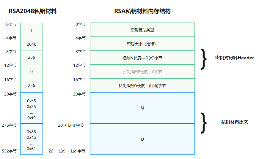 下图为RSA密钥材料内存结构为例,其他算法格式见样例下方表格。