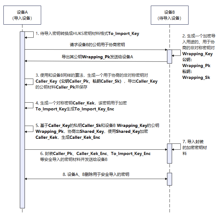 该方式支持业务与HUKS建立端到端的加密传输通道,将密钥安全加密导入到HUKS中,确保导入过程中密钥不被泄露,适用于高安敏感业务。相较于明文导入,安全导入步骤更多,密钥材料更复杂。