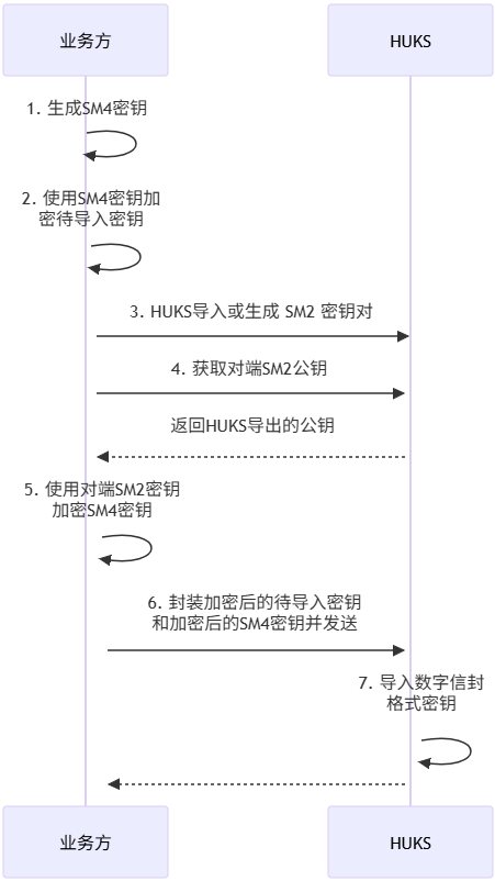 该方式支持以数字信封形式导入密钥,确保密钥安全导入HUKS,防止传输过程中泄露,适用于高安全敏感业务。