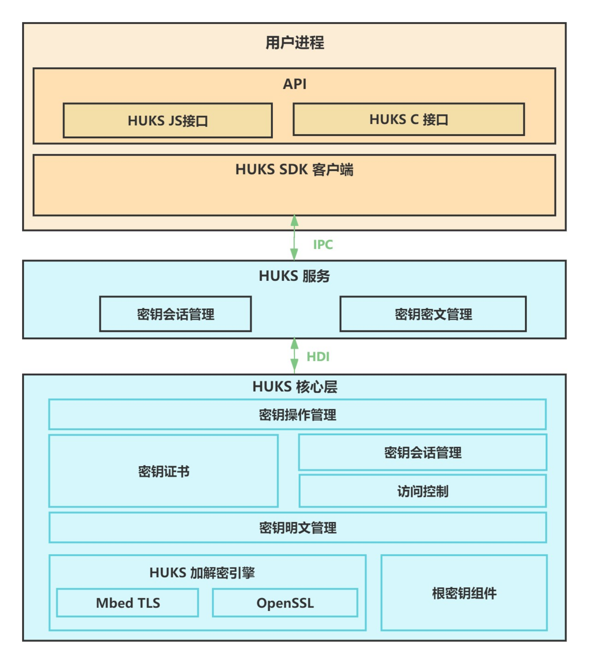 HUKS核心层:承载HUKS的核心功能,包括密钥的密码学运算、明文密钥的加解密、密钥访问控制等。