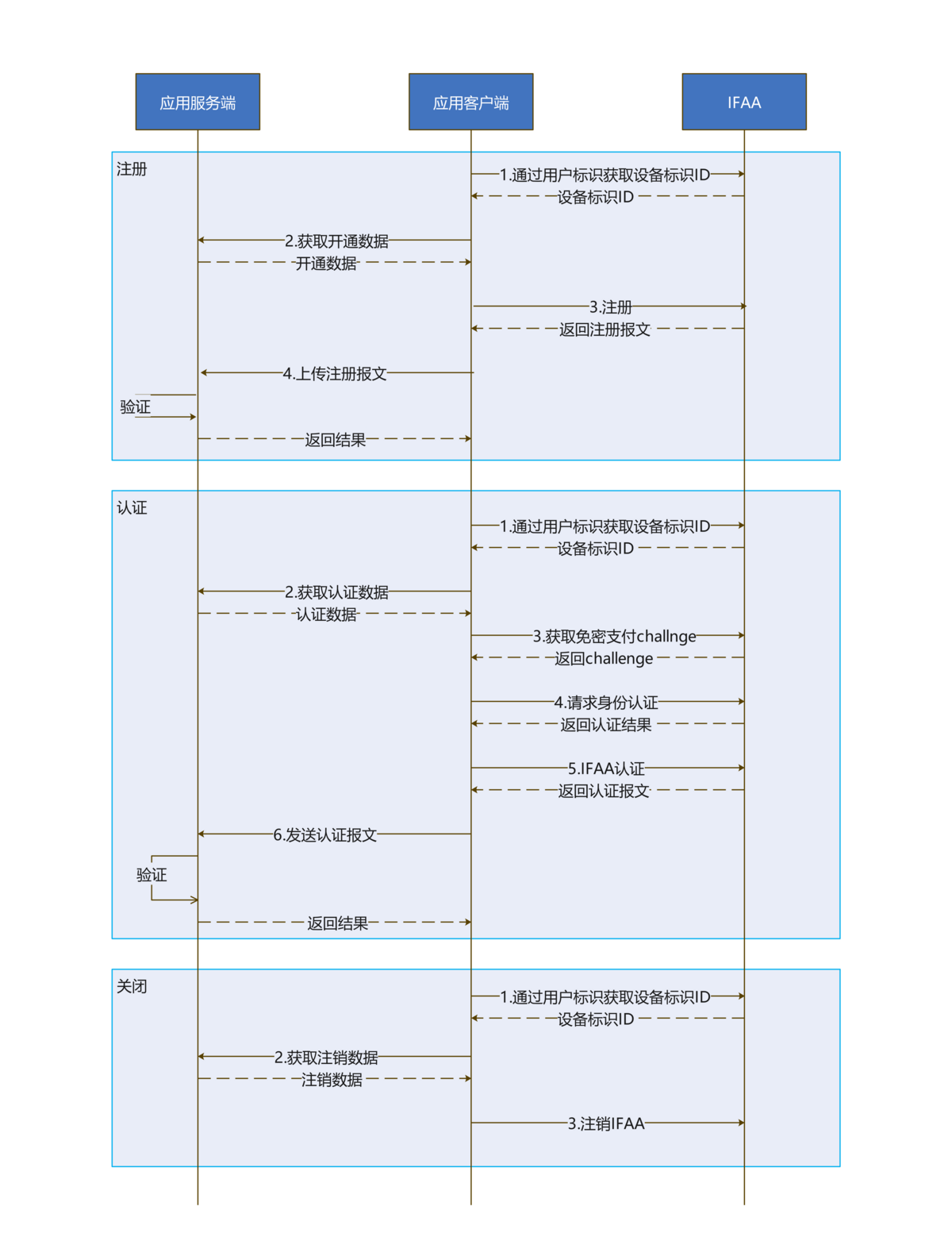 - 开通:提供移动端开通生物特征(指纹/3D人脸)IFAA免密身份认证的能力。使用用户已有的生物特征类型进行开通,会开通移动端对应生物特征类型的IFAA免密身份认证能力。