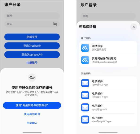 密码保险箱支持在应用和网页中保存和填充账号密码,为了提供更好的密码管理体验,提供了应用和网页共用账号数据的能力。