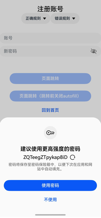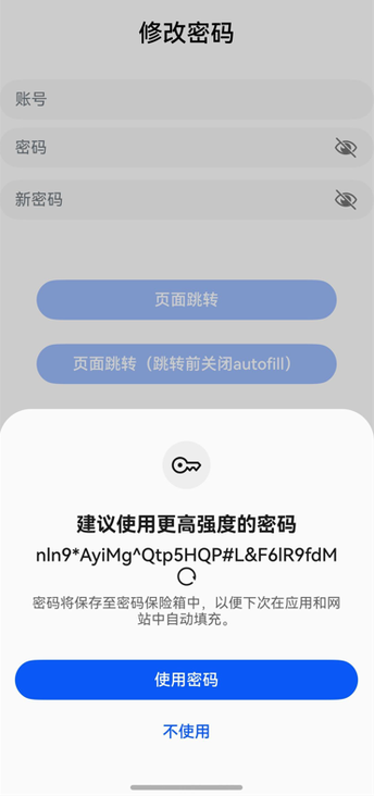 密码保险箱可以在用户需要输入一个新密码时,自动生成一个高强度的密码。用户选择使用生成的强密码时可以将这个密码填充到新密码输入框。