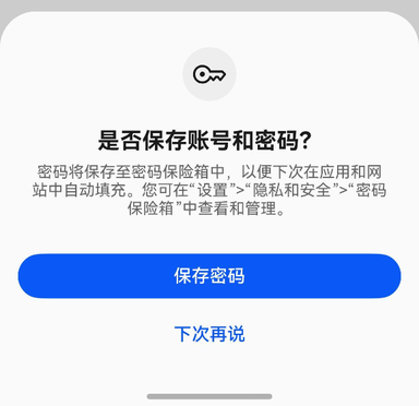 当应用界面触发账号密码自动保存时,若密码保险箱中不存在同应用下的相同账号,系统将弹出账号密码保存提示框,用户点击“保存密码”按钮后,本次使用的账号和密码将被保存至密码保险箱。