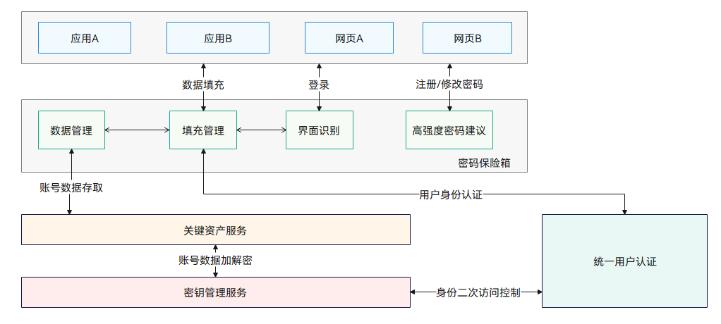 如下图所示,密码保险箱基于关键资产存储能力,保存并保护用户的账号密码。