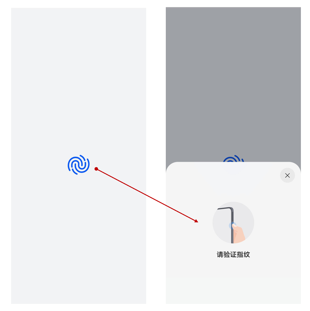 以指纹认证为例,控件使用效果如图所示。应用集成嵌入式用户身份认证控件后,用户点击左图中的指纹图标(即嵌入式用户身份认证控件),系统将自动拉起右图中的系统身份认证控件,完成身份认证。开发者无需通过接口发起身份认证请求,简化了认证流程。