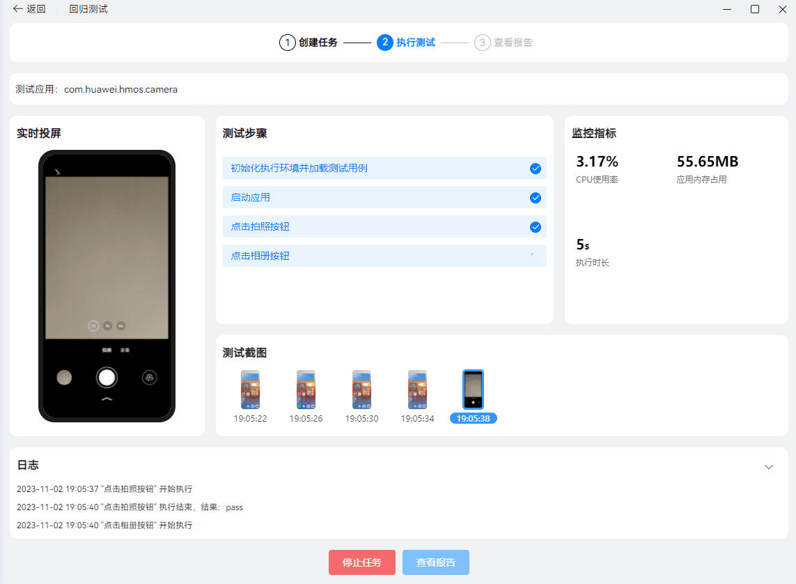 任务创建后即进入测试执行页面,测试过程中,在测试页面可以看到设备实时投屏、设备截图、测试步骤结果上报以及指标数据上报。执行过程中如果脚本执行失败,任务会立刻停止,生成的报告中仅包含任务失败前的数据信息。手动停止查看报告时,报告中仅包含报告停止前的数据信息。