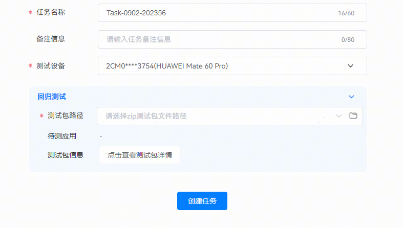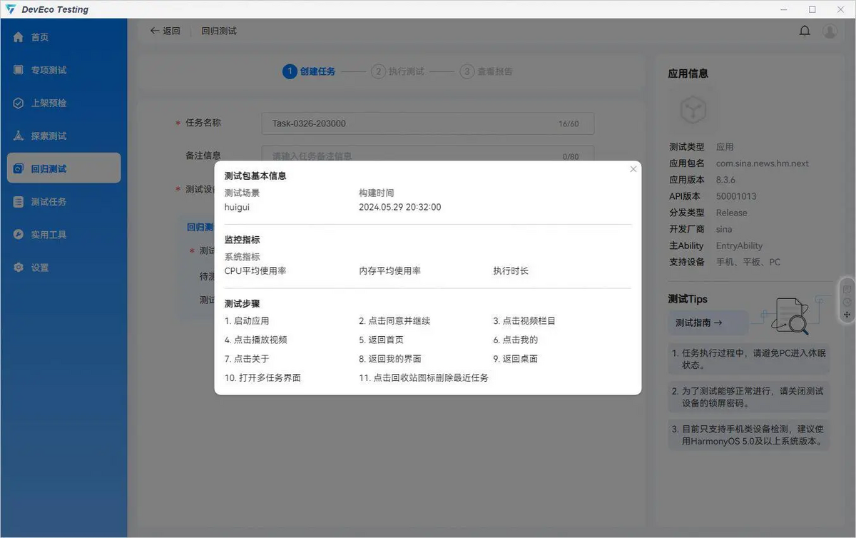 进入DevEco Testing客户端,在左侧菜单栏选择“回归测试”,点击“回归测试”服务卡片,即进入任务创建界面。按需配置任务参数,点击创建任务即开始测试。