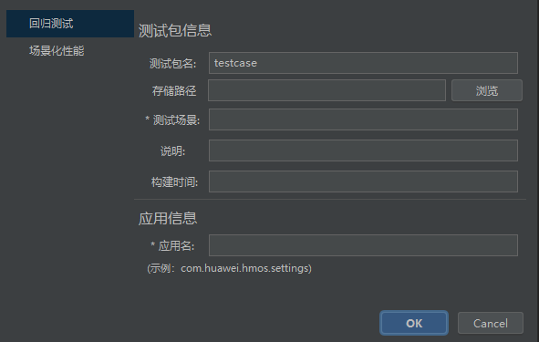 ****步骤四:****在根目录下右键选择“DevEco Testing Hypium”-“生成测试服务包”,出现下图弹窗,选择“回归测试”,用户需填写待测试应用的名称及测试场景,信息填写完毕后点击“OK”即可在指定目录下查看测试包。