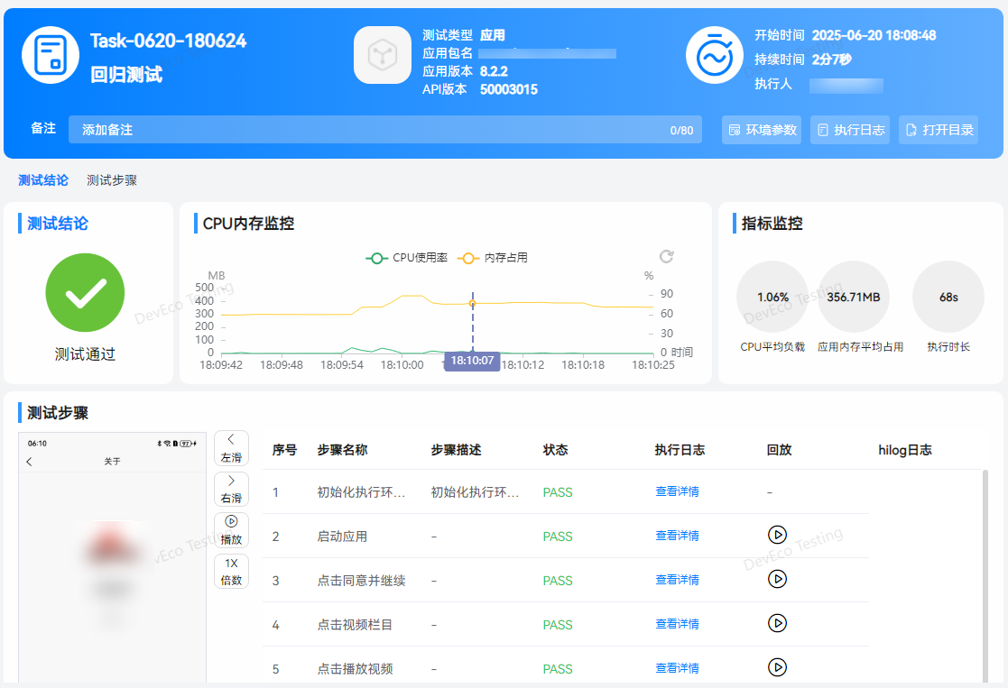 ****回归测试:****针对待测试应用的指定场景,支持通过构建自定义测试包,无需搭建环境即可执行测试用例。用例执行过程中提供实时投屏、步骤截图、步骤结果和测试用例执行日志展示,辅助开发者快速定位问题;此外,测试报告支持指标上报,辅助开发者了解应用的执行性能,助力开发者更高效地打造出高质量应用。