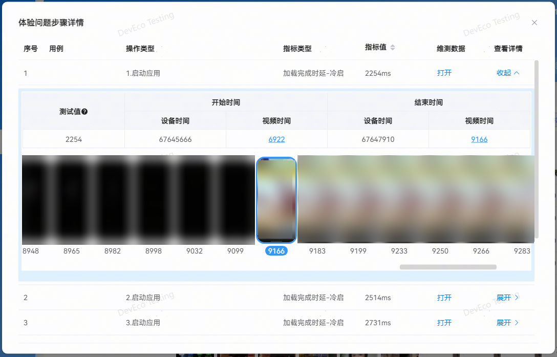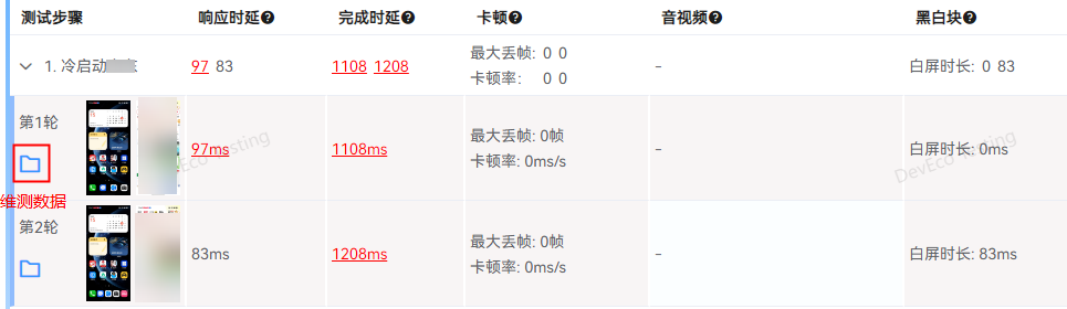 展示应用启动测试的步骤信息,包括操作前后截图、测试数据以及维测数据。