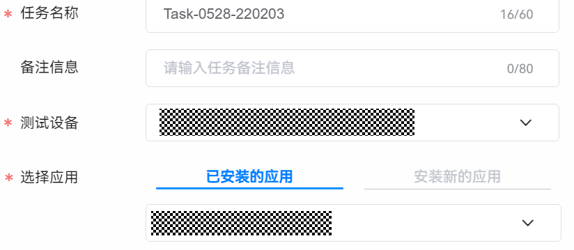 选择应用:可选择测试设备上已安装的应用;或安装新的应用,即在测试设备上安装新的应用包。