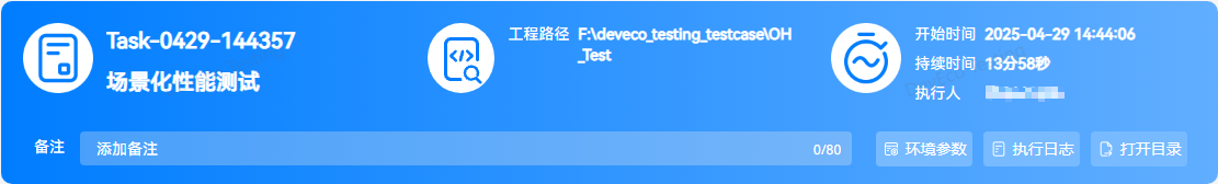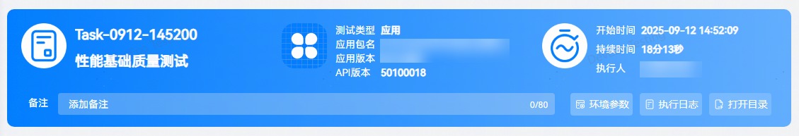 任务信息中,可查看当前应用信息、任务执行时长及详细的环境参数(配置信息及环境信息),点击打开目录按钮支持导出 html 的报告文件。