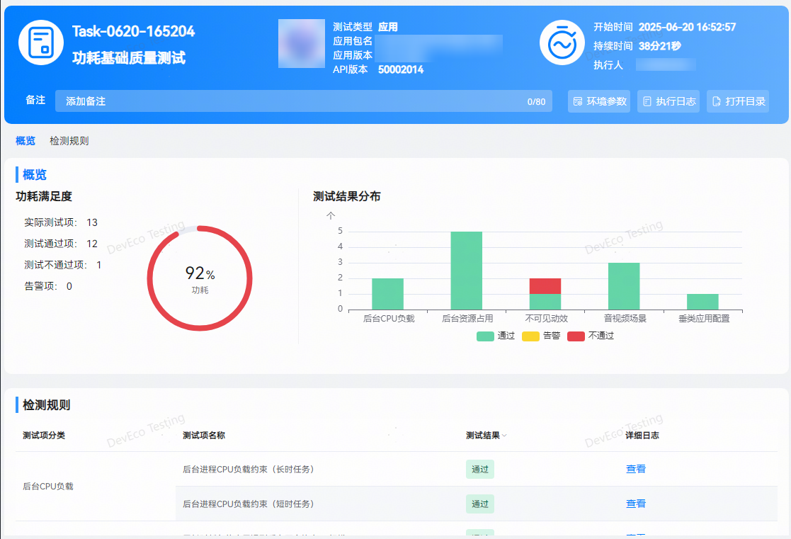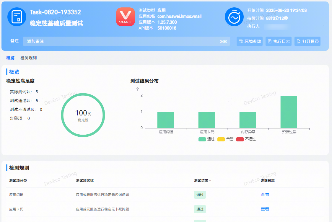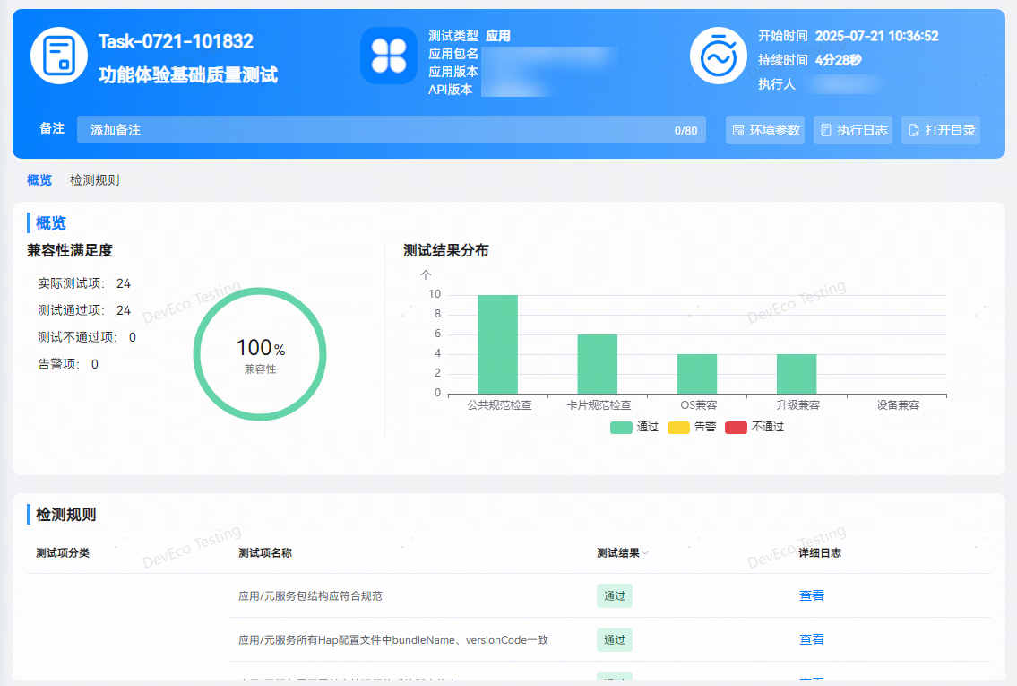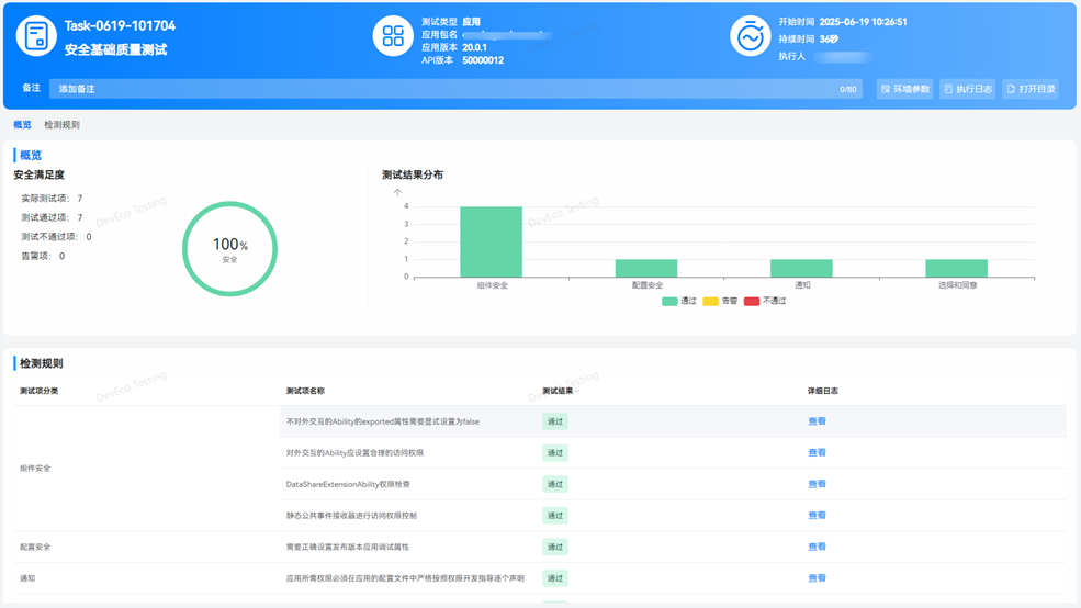 在测试报告中,包含执行结果、问题统计及检测规则。用户可直观查看本次任务中的测试项检测结果。