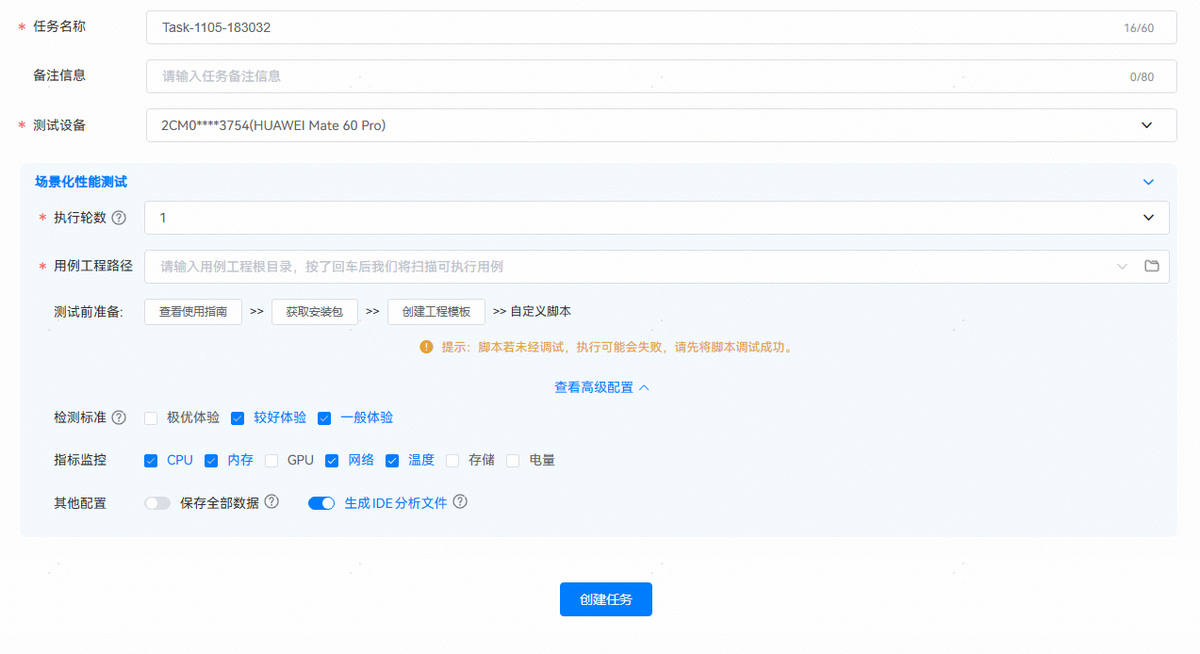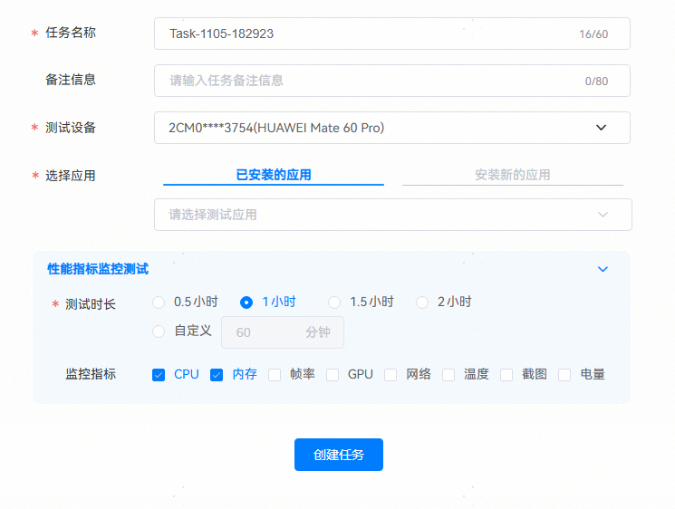 打开DevEco Testing客户端-专项测试-性能指标监控测试卡片,在任务创建界面按需配置任务参数,点击创建任务后开始测试。