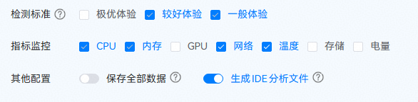 - CPU和内存占用是默认采集,GPU、网络、电量和温度为可选项,可在任务创建页面“高级配置”中勾选。