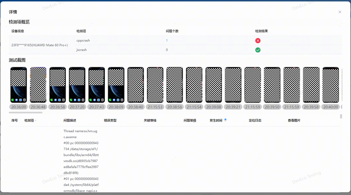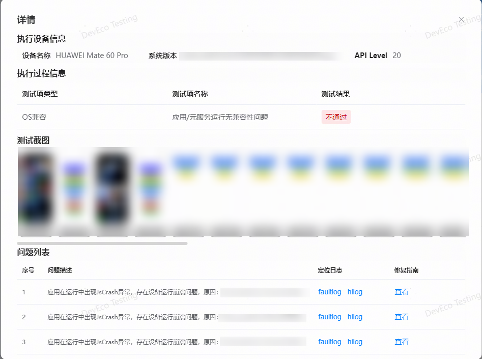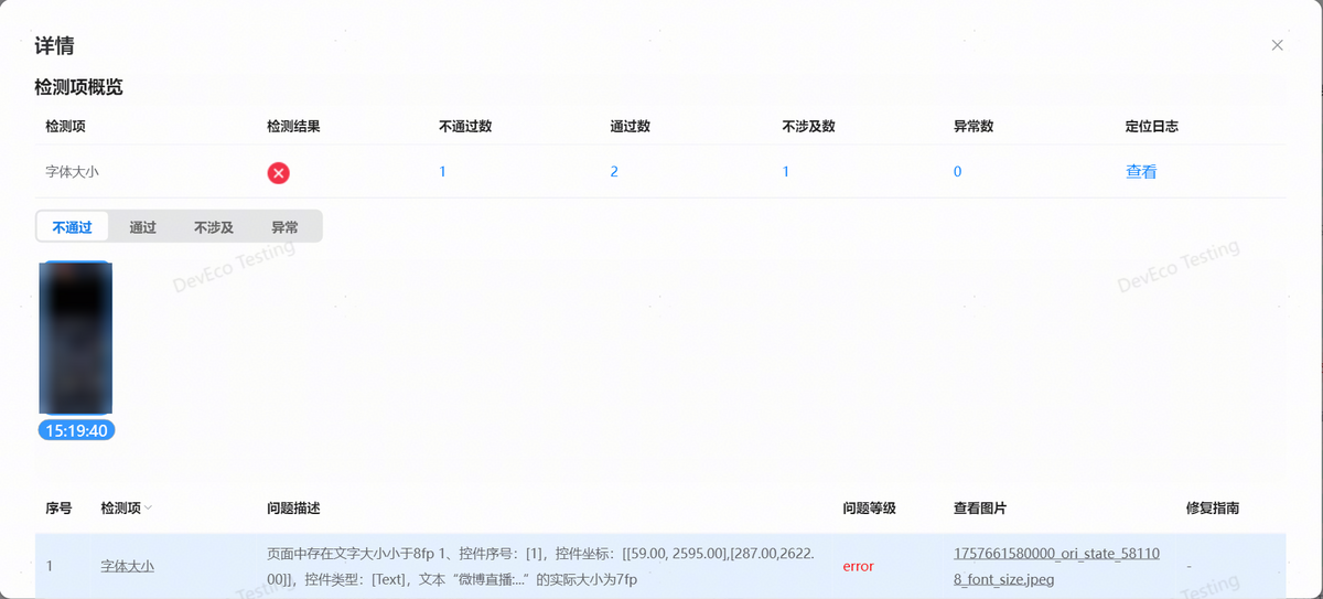 检测不通过的规则项,点击查看按钮查看问题详情,包含执行设备信息、执行过程信息、测试截图、问题列表等。